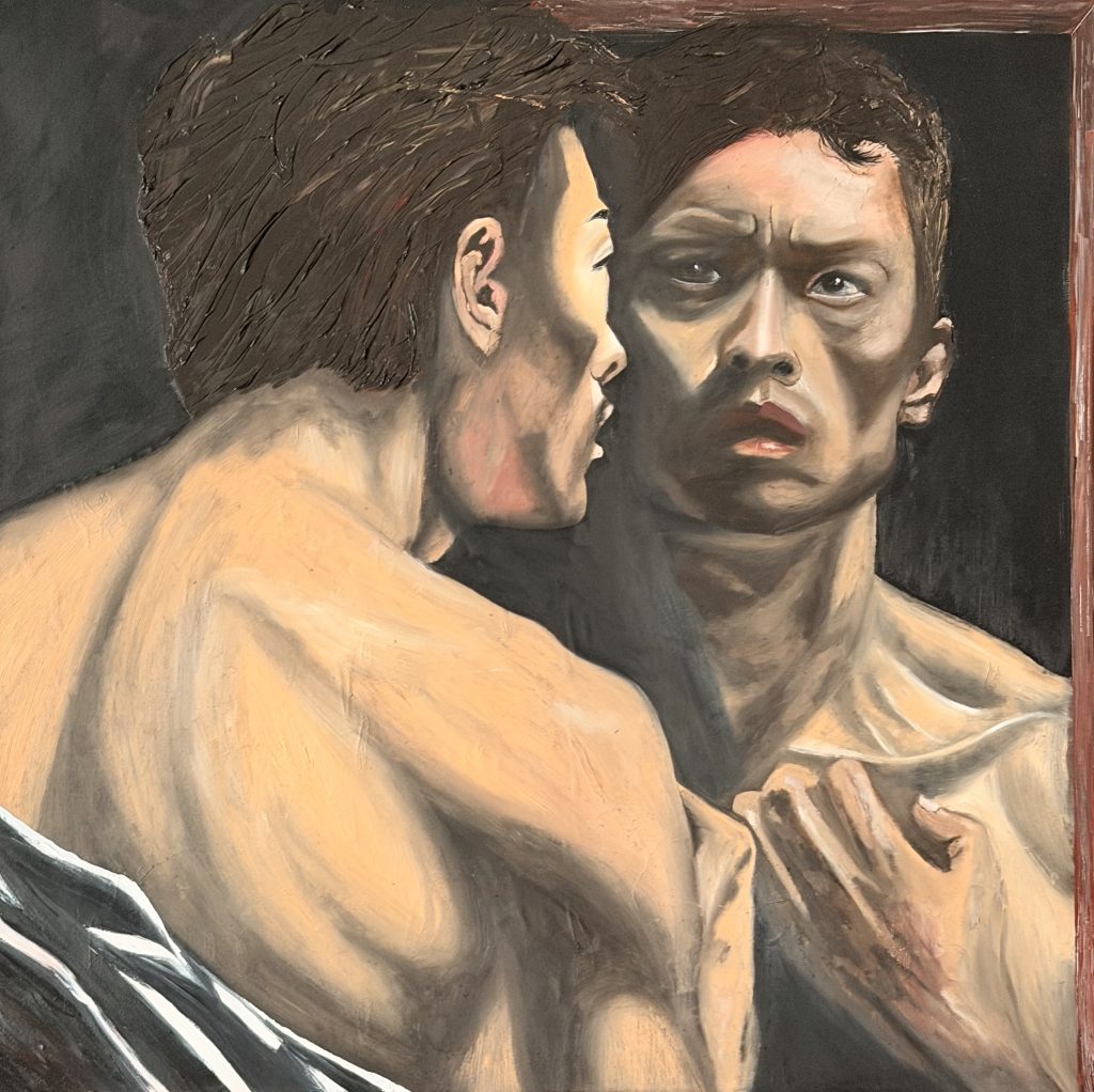 Hay una resonancia inevitable con la densidad de Caravaggio: ese contraste crudo, esa carne iluminada en medio del fondo oscuro. Pero mi pintura no se instala en su mundo; lo atraviesa. Dialoga con esa herencia y la lleva hacia mi propio territorio. Mi trazo es más visceral, más directo, menos narrativo. Busco tensión, no escena.